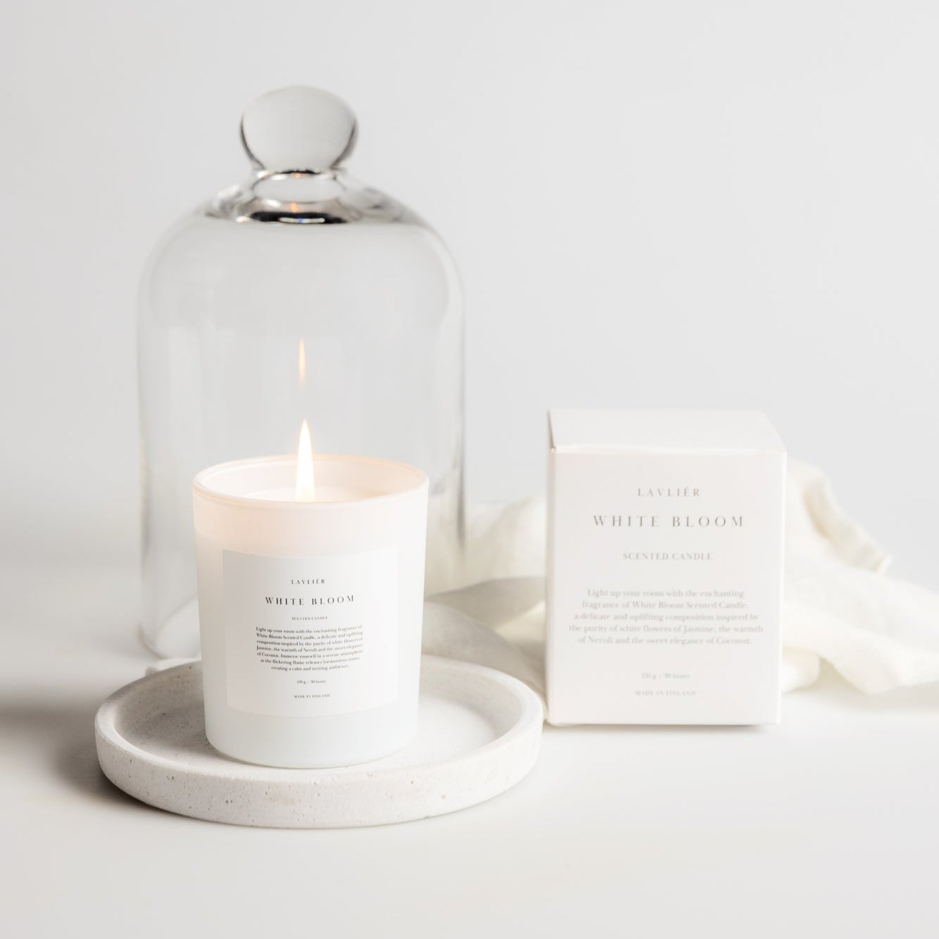 The White Bloom Scented Candle is made in Finland with high-quality wax, ensuring a clean and even burn. The flickering flame dances gracefully, casting a warm and comforting glow that complements the tranquil fragrance. As the candle melts, the room becomes a sanctuary of relaxation, inviting you to unwind and appreciate the timeless beauty of white blooms.
