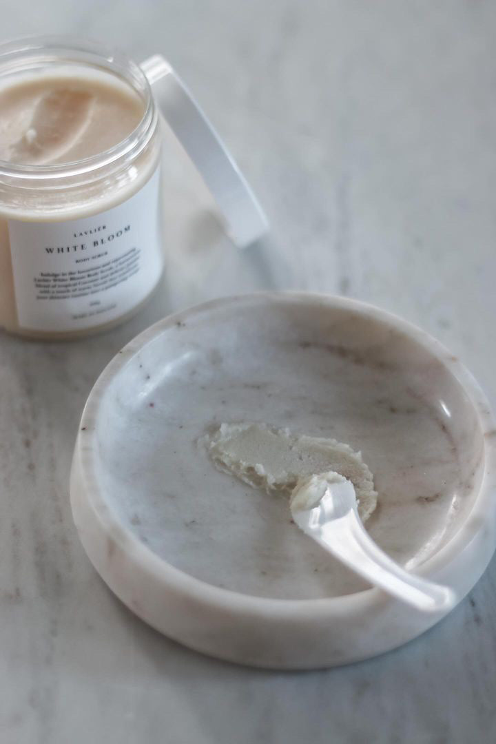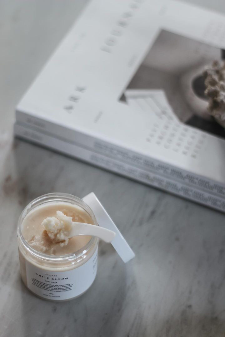 Lavliér White Bloom Body Scrub -vartalokuorintasuolan tyylikäs pakkaus tuo kylpyhuoneeseen ripauksen hienostuneisuutta.